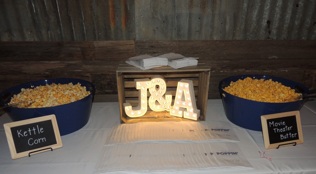 The Bride and Groom included some sweet touches to the celebration such as up-lighting with their names displayed on the wall, and the couple also served Kettle-corn and Movie Popcorn as one of the appetizers with cute sacks that said, “Thanks for Poppin’ in on our big day!”