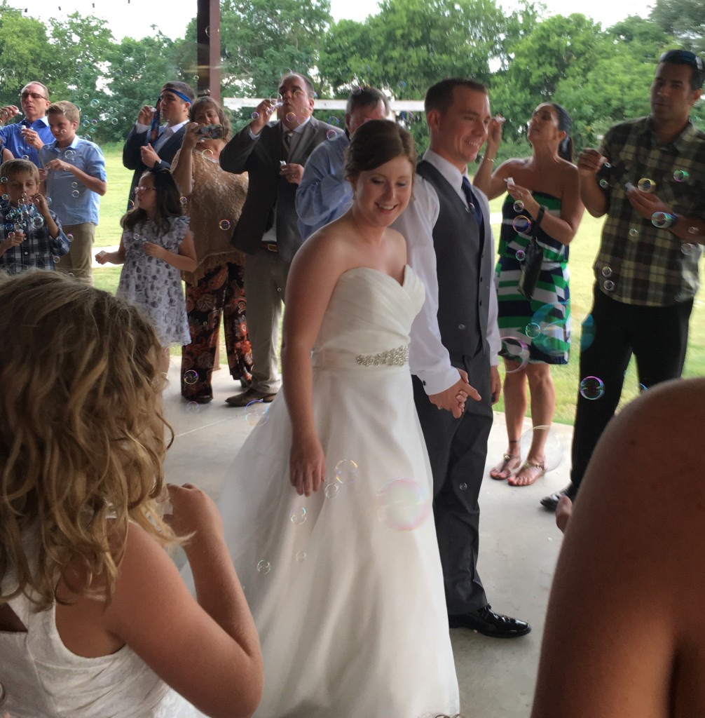 For their final farewell, the guests were blowing bubbles of wedding wishes for the new Mr. and Mrs.